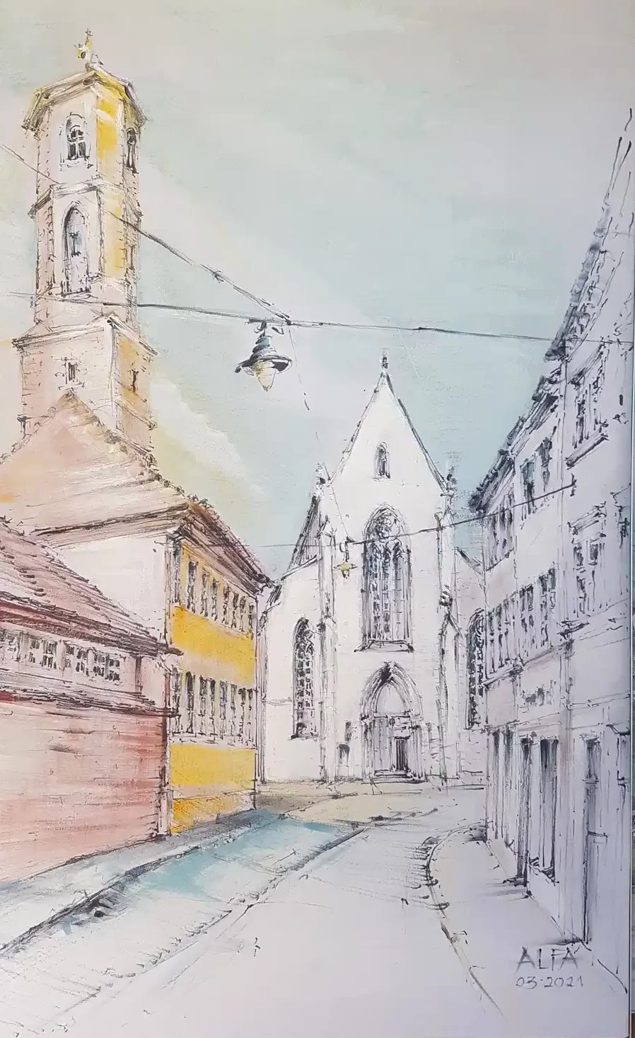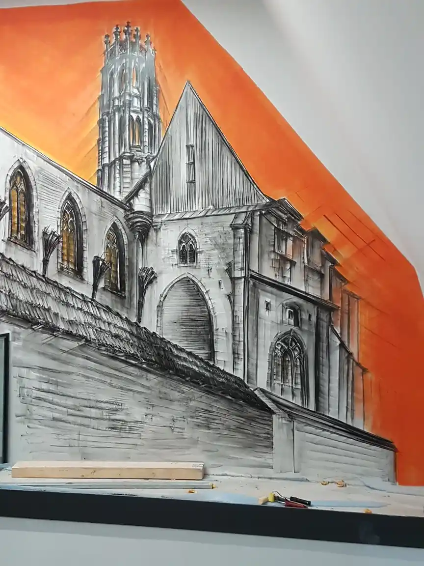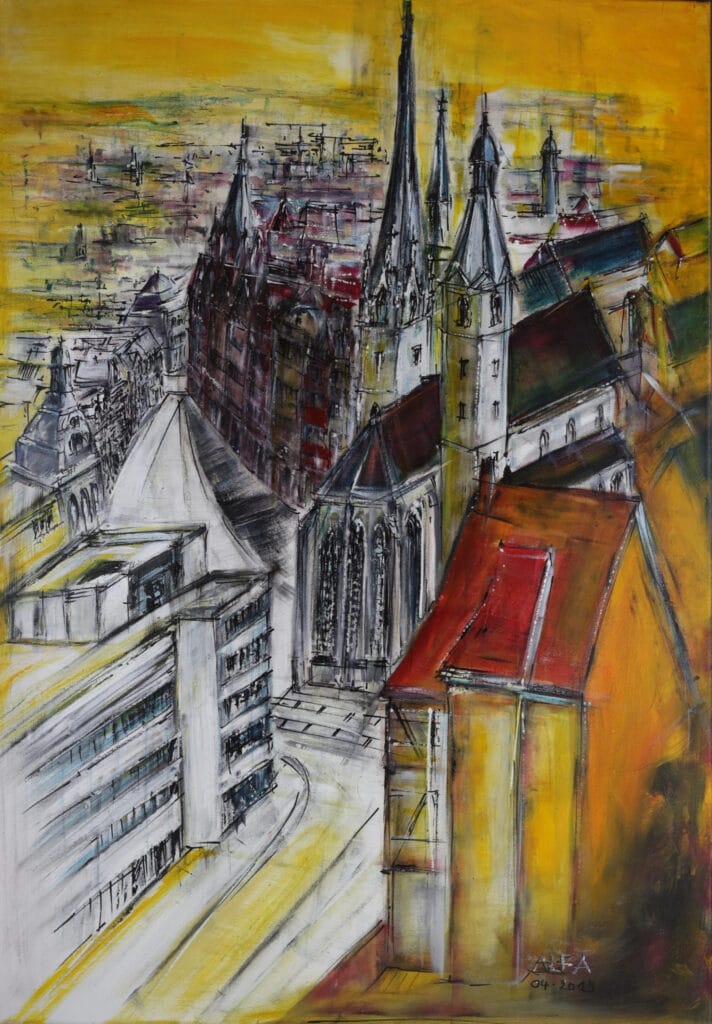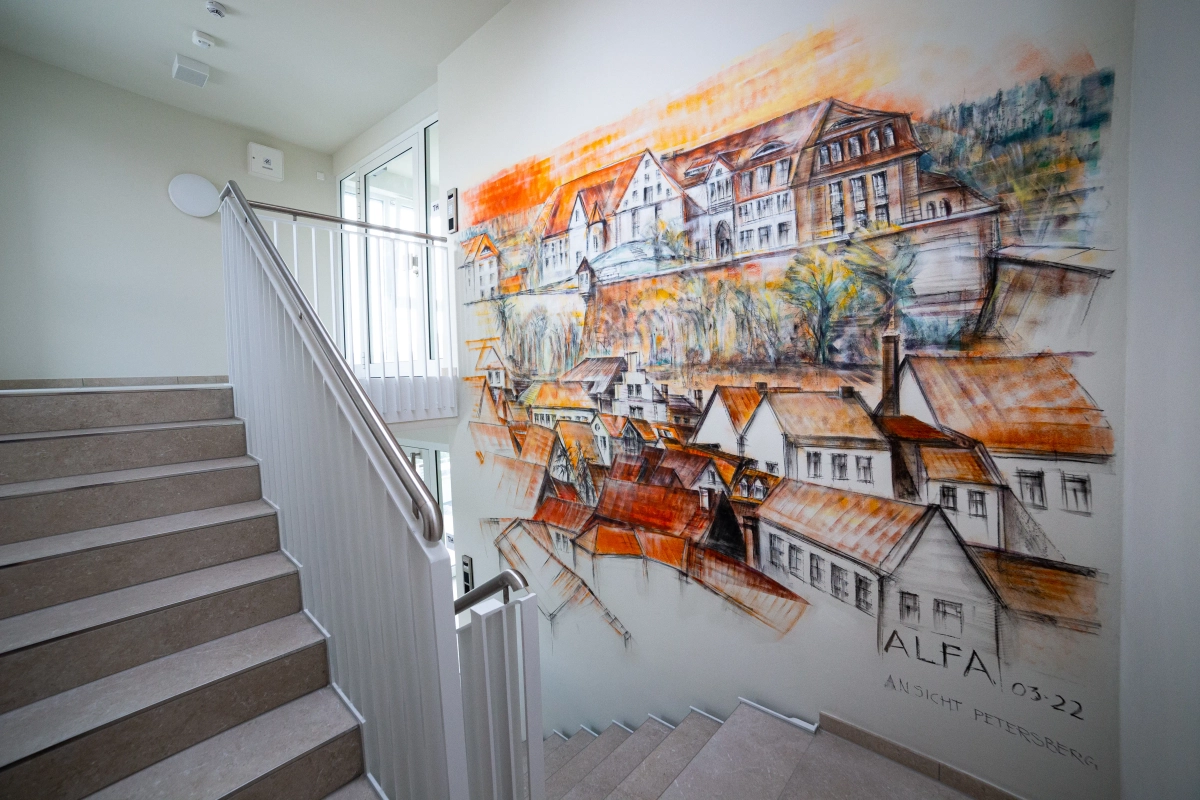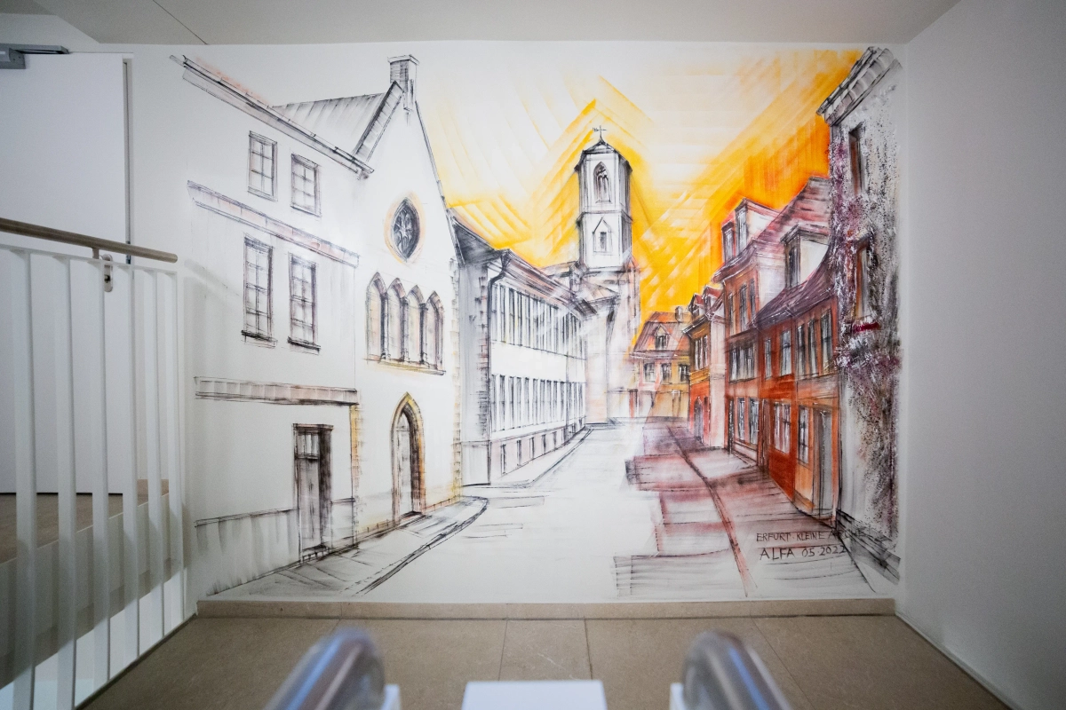 wurden 2 Eingangssituationen / Treppenräume mit Wandmalereien zu typischen Städtebaulichen Ensembles der Erfurter Altstadt künstlerisch in Szene gesetzt.