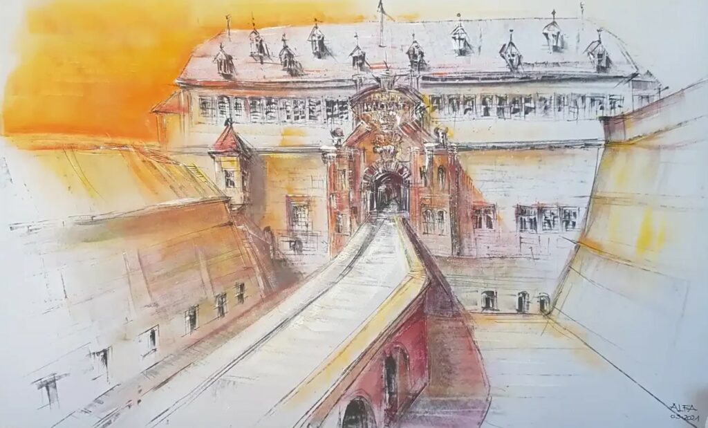 nach vorherigen Skizzen und Entwicklung der Bildkomposituation gestaltet.
