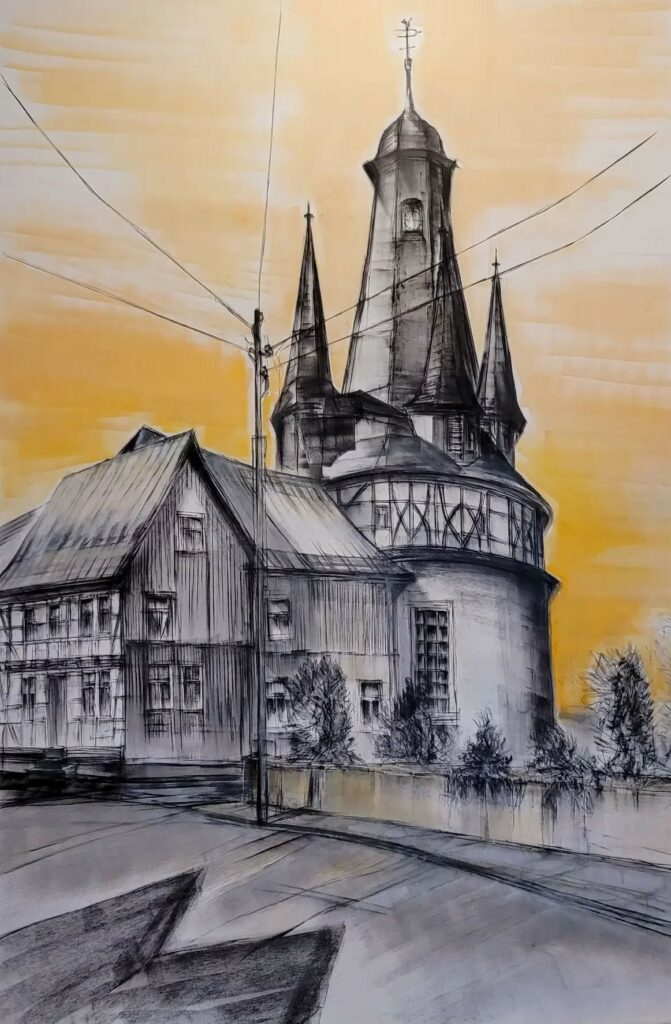 als Wandmalerei in Acryl- Kreidetechnik in Szene gesetzt und bildet den Auftakt zur großformatigen Wandmalerei: „ Gerstungen- Ansicht von der Werrabrücke“ im kleinen Saal mit ca. 20 qm gestaltete Wandfläche.