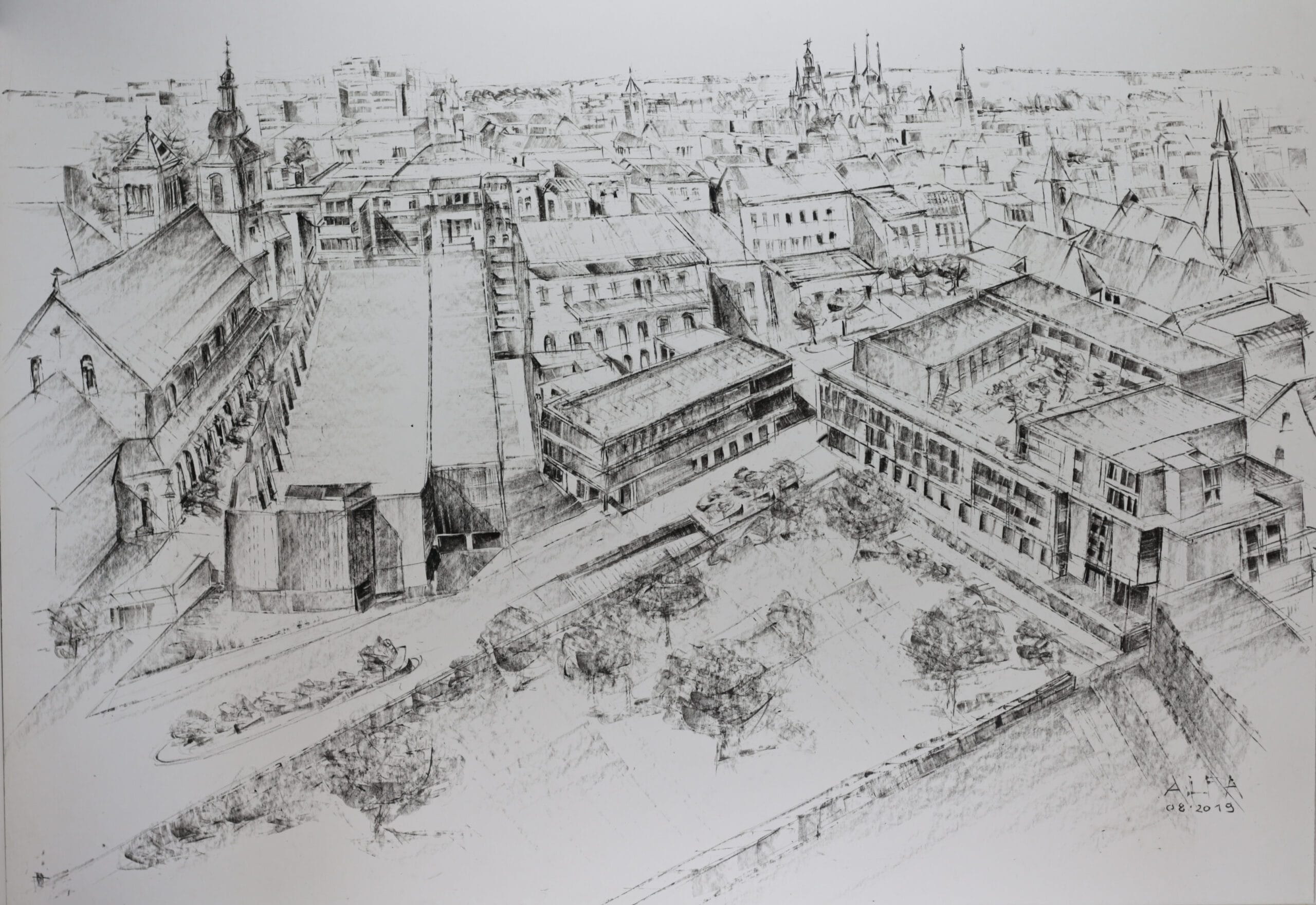 Auf Basis vorbereitender Zeichnungen von Straßen Räumen und wichtiger Gebäudeensembles sind 11 Motive in Flächen von 10 – 24 qm gestaltet. Zusätzliche Effekte bewirken das durch die großflächige Verglasung einfallende Seitenlicht und Spiegelungen der Glasgeländer.