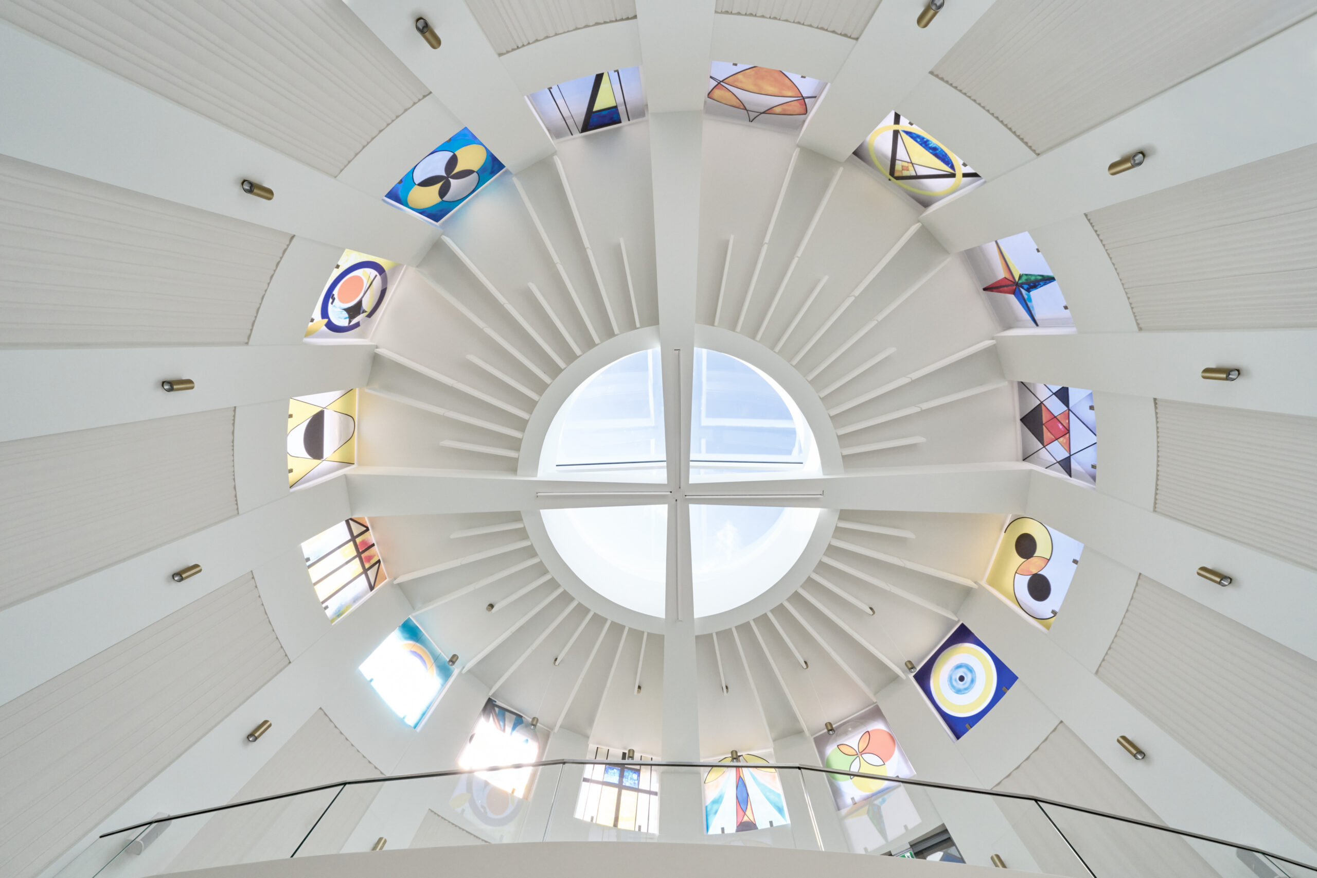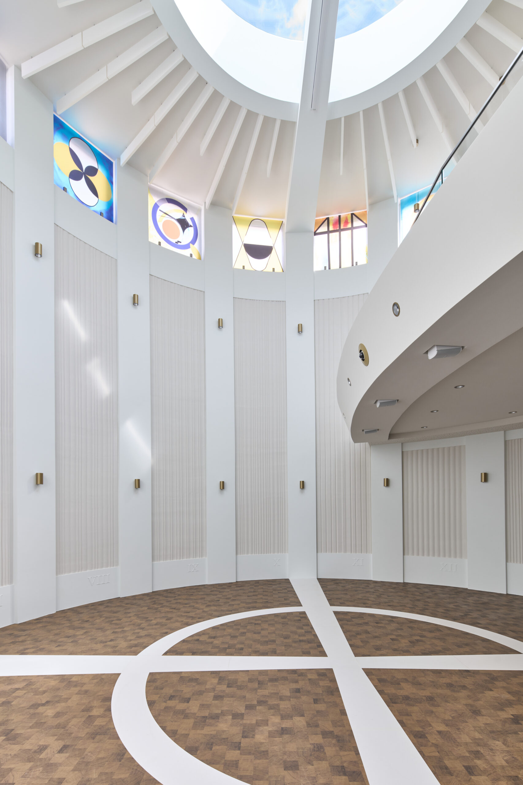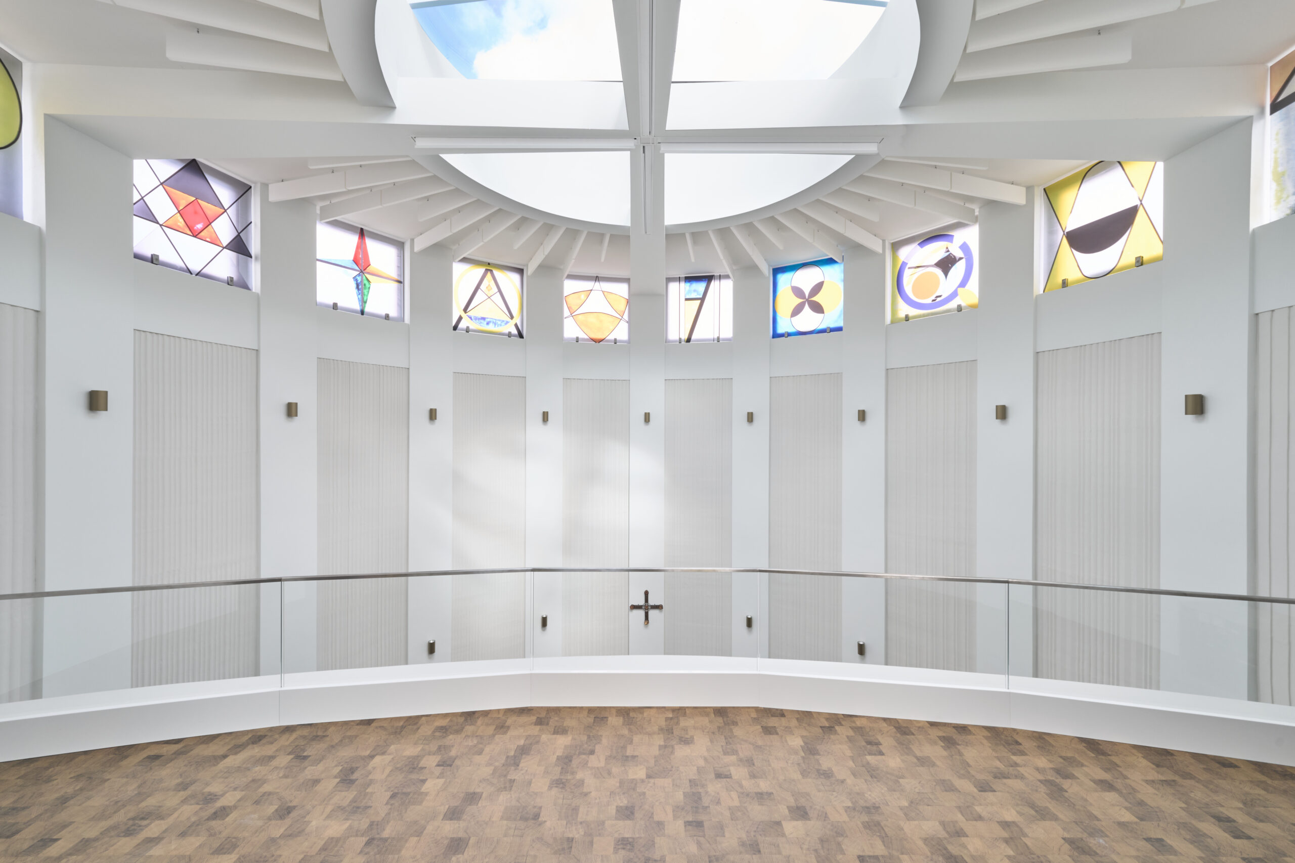 Die vertikal gerillten Paneele beruhigen den Nachhall und geben dem Raum eine zurückhaltende Ordnung. Die Glasbilder arbeiten mit einfachen Formen – Kreis, Kreuz, Dreieck – und sanften Farben, die je nach Licht über die Wände wandern.