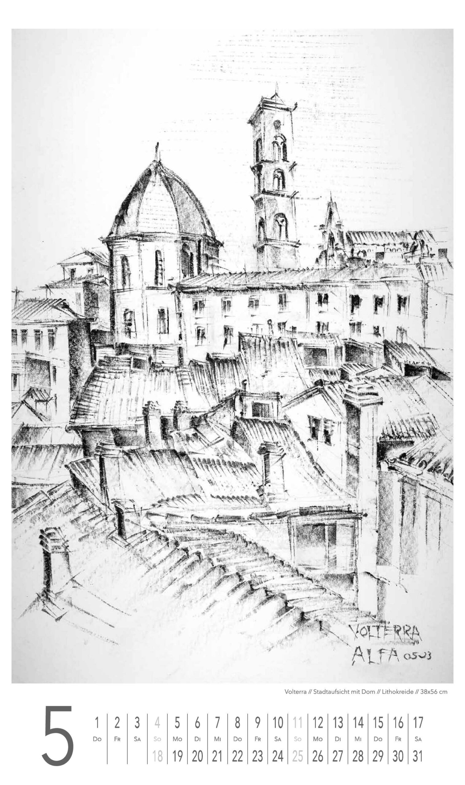 Für Kalender 2025 – Bella Italia habe ich Stadtlandschaften und Plätze in klaren, reduzierten Blättern festgehalten. Mich interessieren Lichtachsen, Kanten, Stein. Zu sehen sind u. a. San Gimignano, die Kathedrale von Todi, eine Gasse in Mantua, der Corso Cavour in Orvieto, Assisi Altstadt, Pitigliano und die Piazza della Repubblica in Cortona – ergänzt um weitere Orte der Reise. Jede Monatsseite ist eine kurze Studie von Raum und Ruhe, ohne Postkartenpathos, als leiser Begleiter durchs Jahr.
